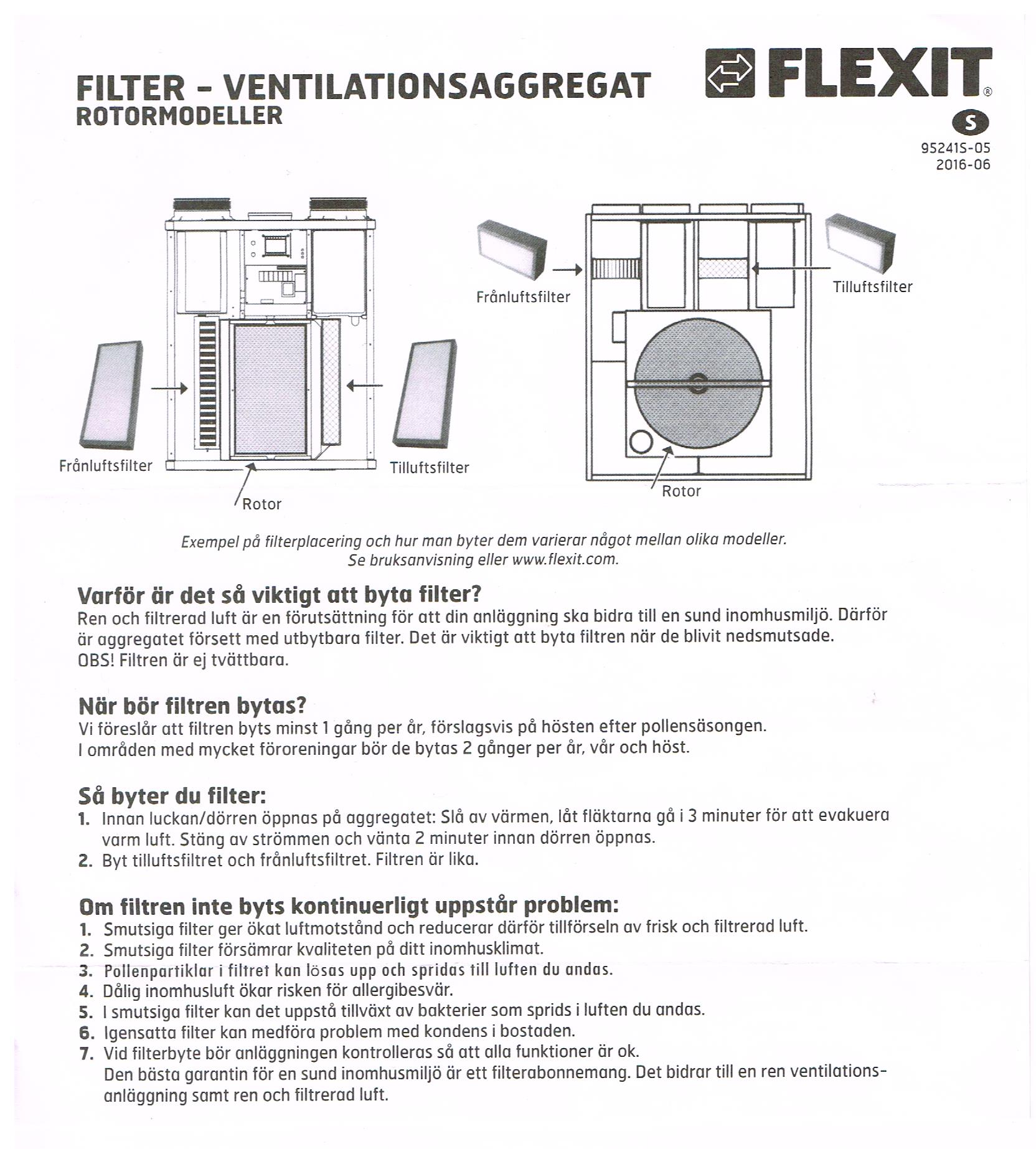 Varje år måste/bör de två filter som finns i systemet bytas för att få maximal verkningsgrad på systemet. Rekommenderat är att byta filter i september/oktober efter sommaren och pollensäsong.